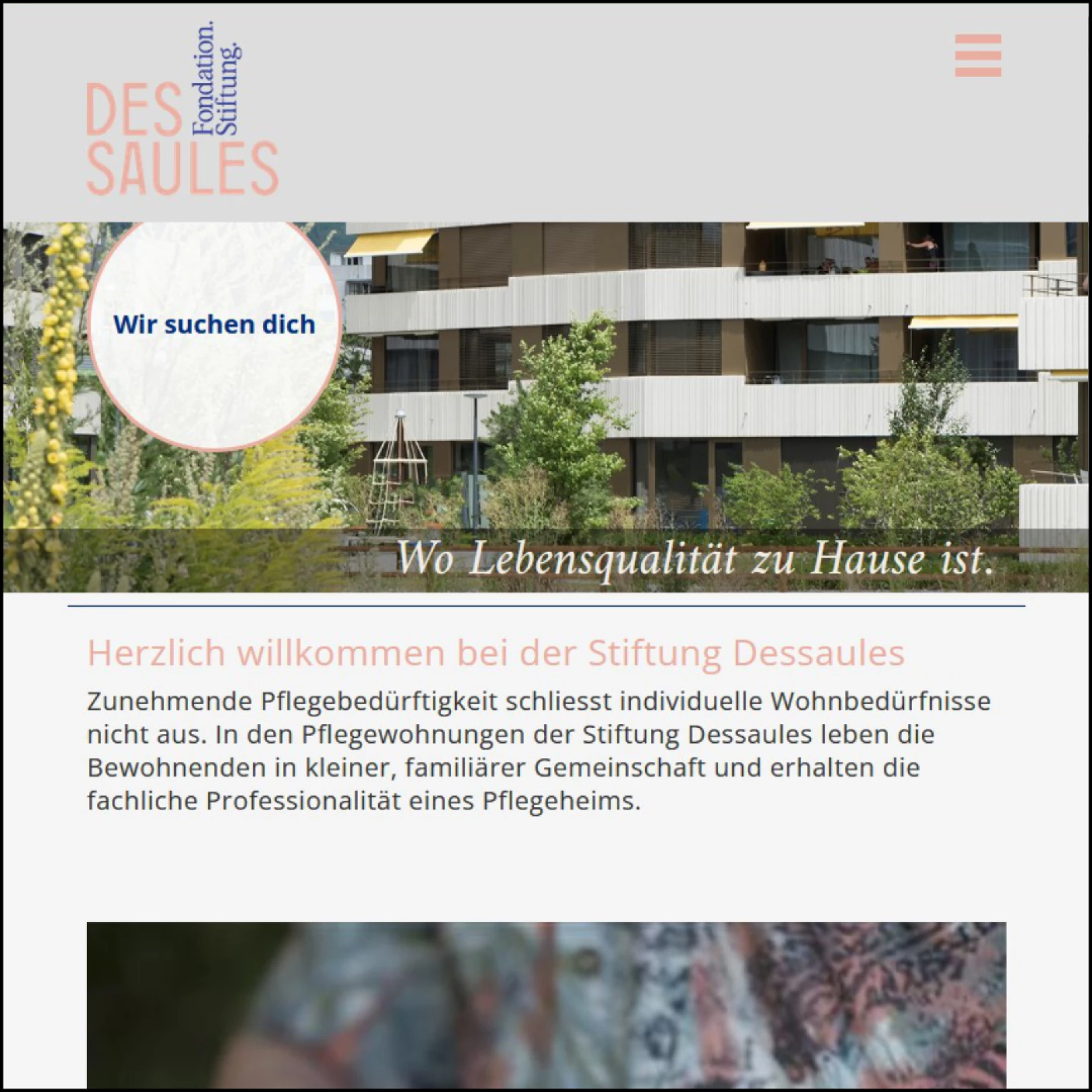 Die Stiftung Dessaules in Biel bietet Pflegewohnungen mit familiärem Ambiente für pflegebedürftige Personen aus der Region Biel an. Freiwillig engagierte Personen leisten den Bewohnenden der Stiftung Gesellschaft, lesen vor, machen kleinere Besorgungen, gehen gemeinsam spazieren oder hören einfach nur zu. Du hast eine besondere Idee, wie du dich sonst noch als Freiwillige:r einbringen könntest? Die Stiftung freut sich über deine Ideen!