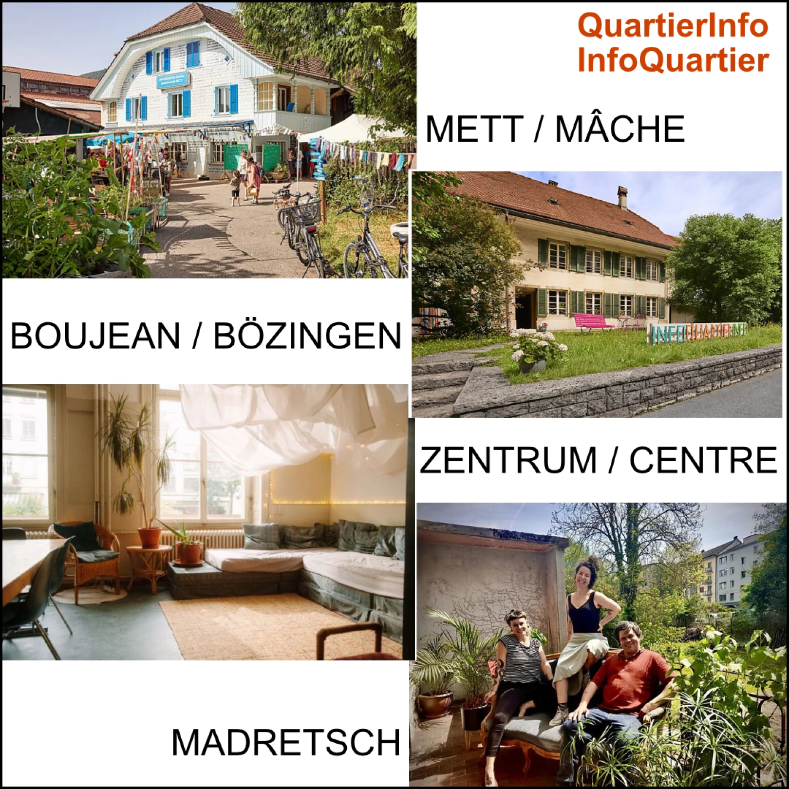 In jedem der vier Bieler Stadtteile Zentrum, Bözingen, Mett und Madretsch gibt es mit den «QuartierInfo» einen Treffpunkt wo man Menschen aus der Nachbarschaft kennen lernen und sich austauschen kann. Interesierte können an Aktivitäten teilnehmen und erhalten Informationen über Freizeitaktivitäten und Unterstützungsangebote. Freiwillige unterstützen und wirken mit. Sowohl in den Betrieben der QuartierInfos selbst als auch bei punktuellen Hilfeleistungen im Quartier. Interessiert? Die Leiterinnen der vier QuartierInfos freuen sich, dich kennen zu lernen!