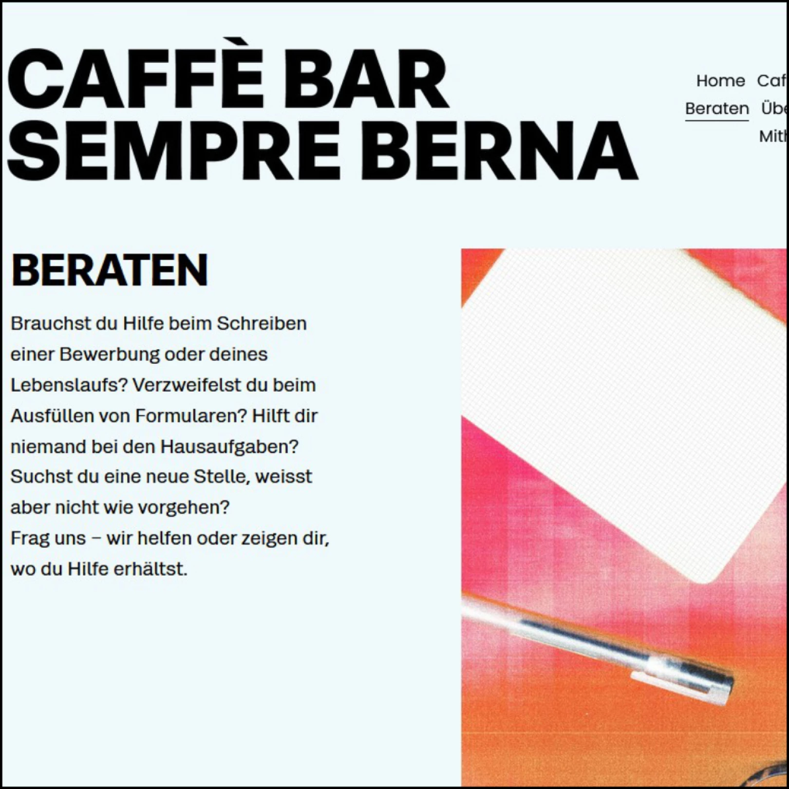 Seit dem 18. November 2025 versprüht die Caffè Bar Sempre Berna an der Schwarztorstrasse 102 in Bern einen Hauch Italianità. Das Quartiercafé bietet jedoch viel mehr als nur Espresso und Spuntini: die freiwilligen Mitarbeitenden von Sempre Berna sind da für ein Gespräch, unterstützen und beraten - kostenlos, ohne Termin und ohne Dossierführung. Möchtest du dich als Freiwillige:r für ein spannendes, niederschwelliges Projekt in Bern engagieren und deine Ideen und dein Wissen mit einbringen? Dann bist du hier am richtigen Ort!